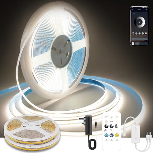 FUIQI Dotless COB LED Strip 20M,24V Dimmable Flexible LED Light Strip with App & Remote,Warm White 3000K,CRI>90,8mm Cuttable Self-Adhesive COB Tape for Kitchen,Bedroom,Mirrors Decoration