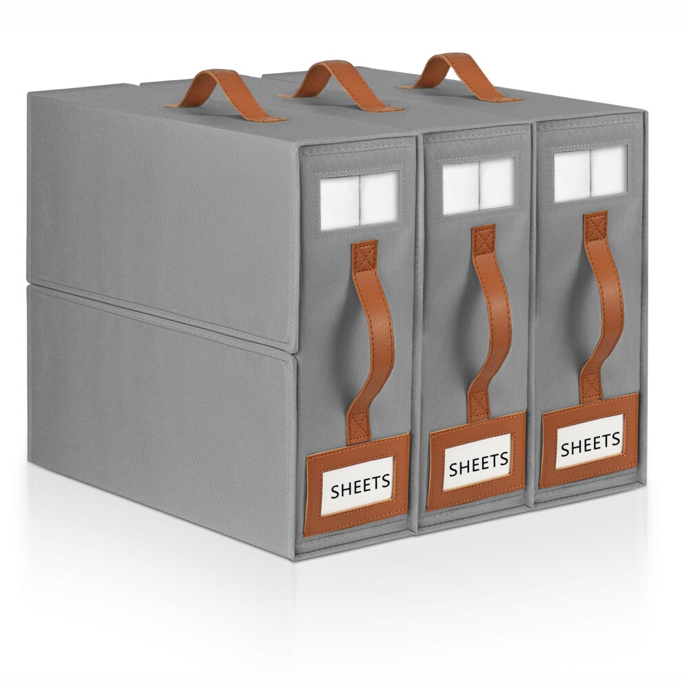 BigPonPon 4 Pack Bed Sheet Organizers And Storage,Foldable Sheet Organizer For Linen Closet(Super King Size),Linen Bedding Storage Box With Leather Handle For Bedsheets,Flannel Blankets,Thin Quilts