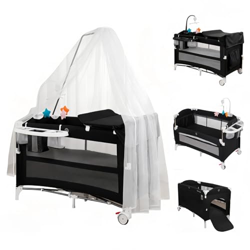 Oubeauou Convertible Baby Cot 3 in 1 with Diaper Table, Portable Playbed, Bedside Cots, Metal Frame, 125x65x76cm, Includes Mattress, Mosquito Net, Music Toy Rack, Storage Shelf, 0-3 Years (BLACK)