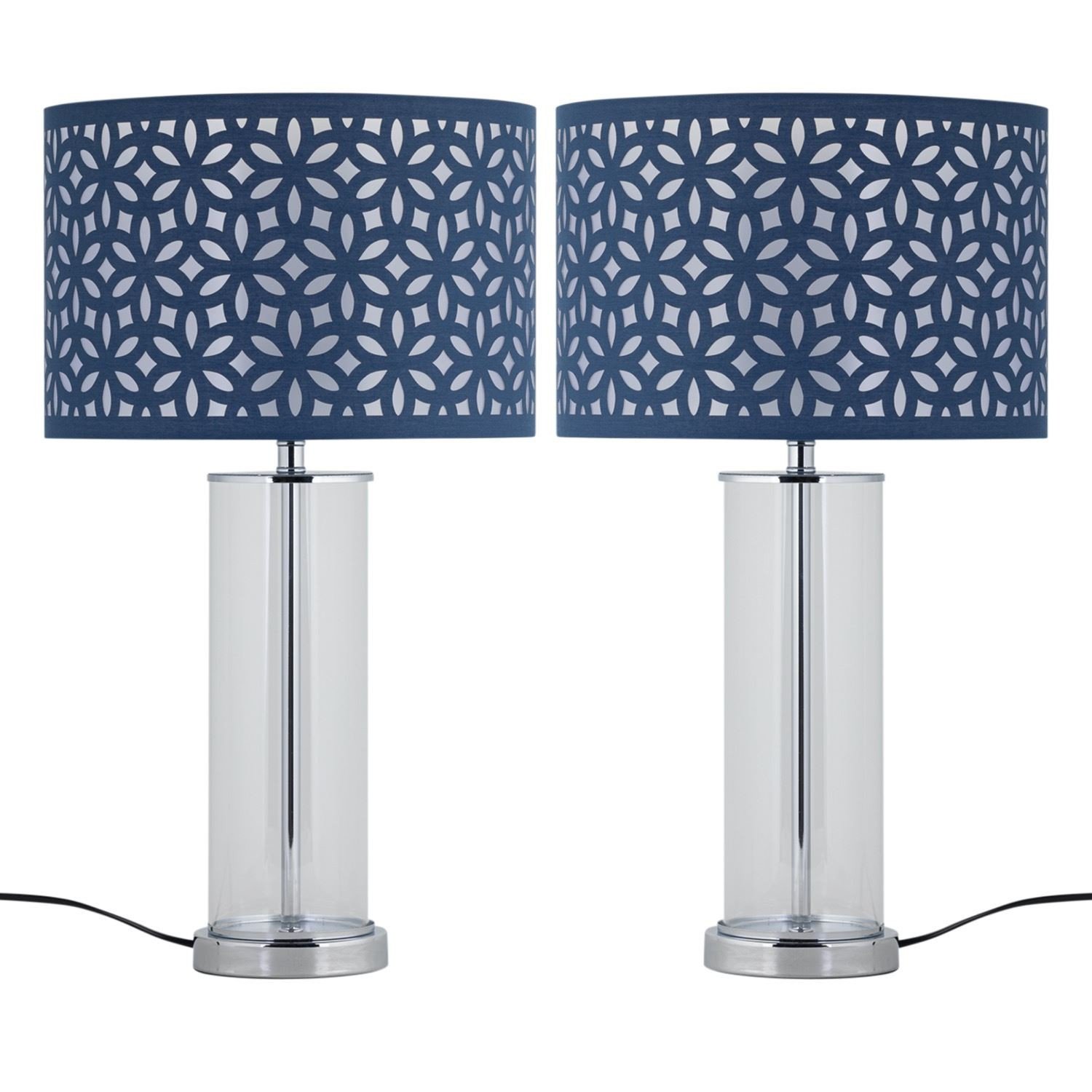 Set of 2 Modern Chrome Glass Table Lamp Bedside Lights Navy Blue Cut Out Shades