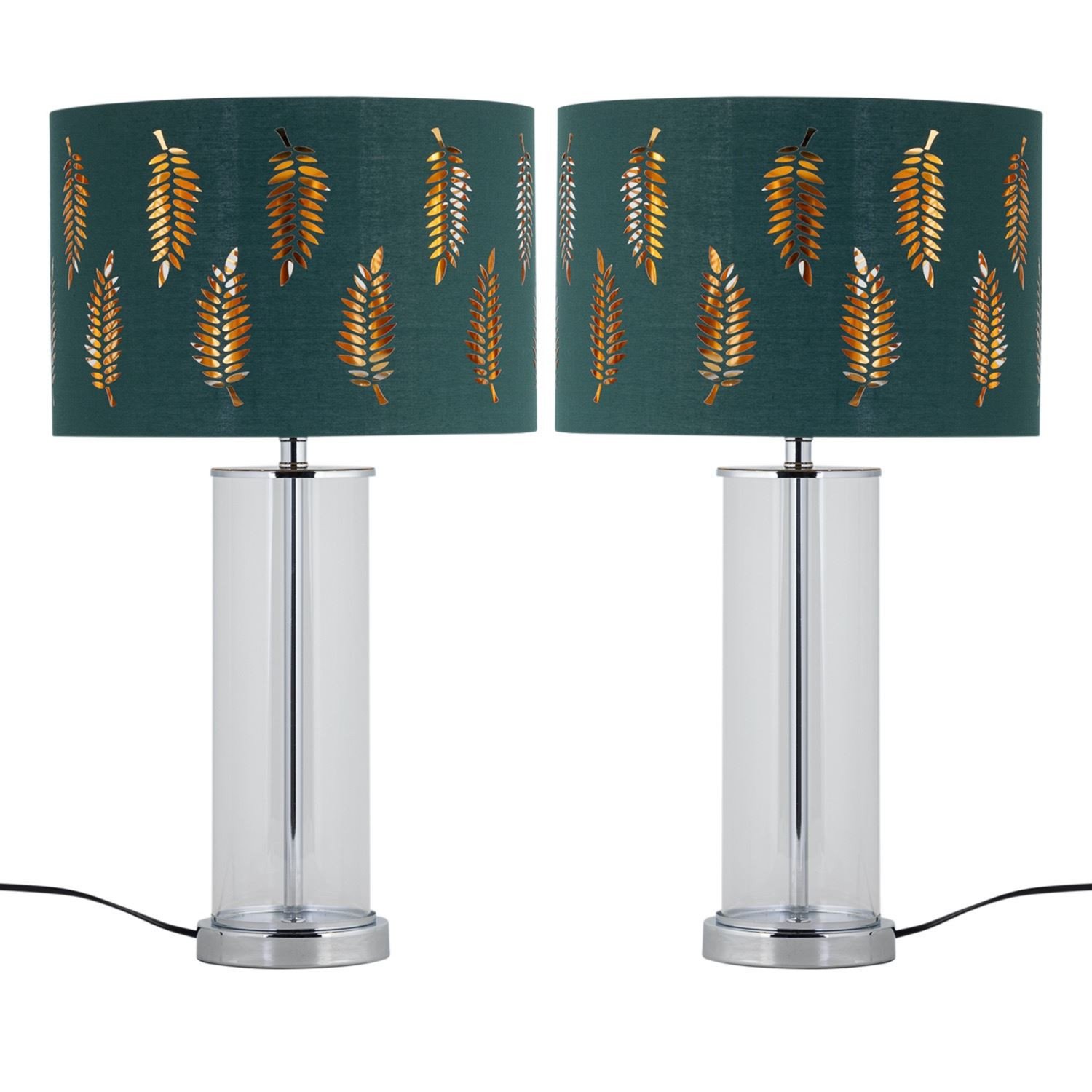 Set of 2 Modern Chrome & Glass Table Lamp Bedside Lights Green Fern Shades