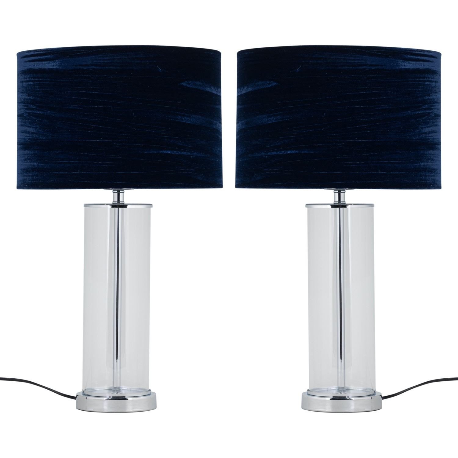 Set of 2 Modern Chrome & Glass Table Lamp Bedside Lights Navy Velvet Shades