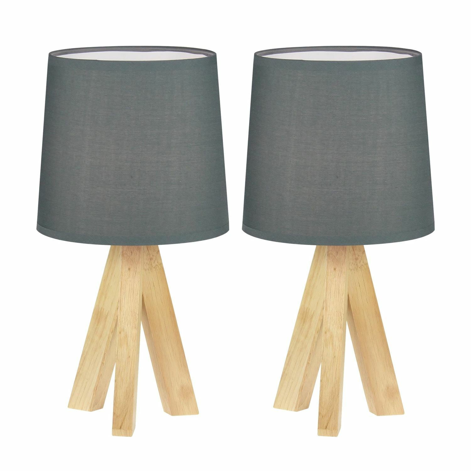 Set of 2 Modern Oak Table Lamp Bedside Lights Wood Tripod Grey Silver Shades