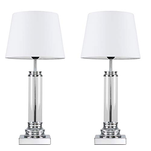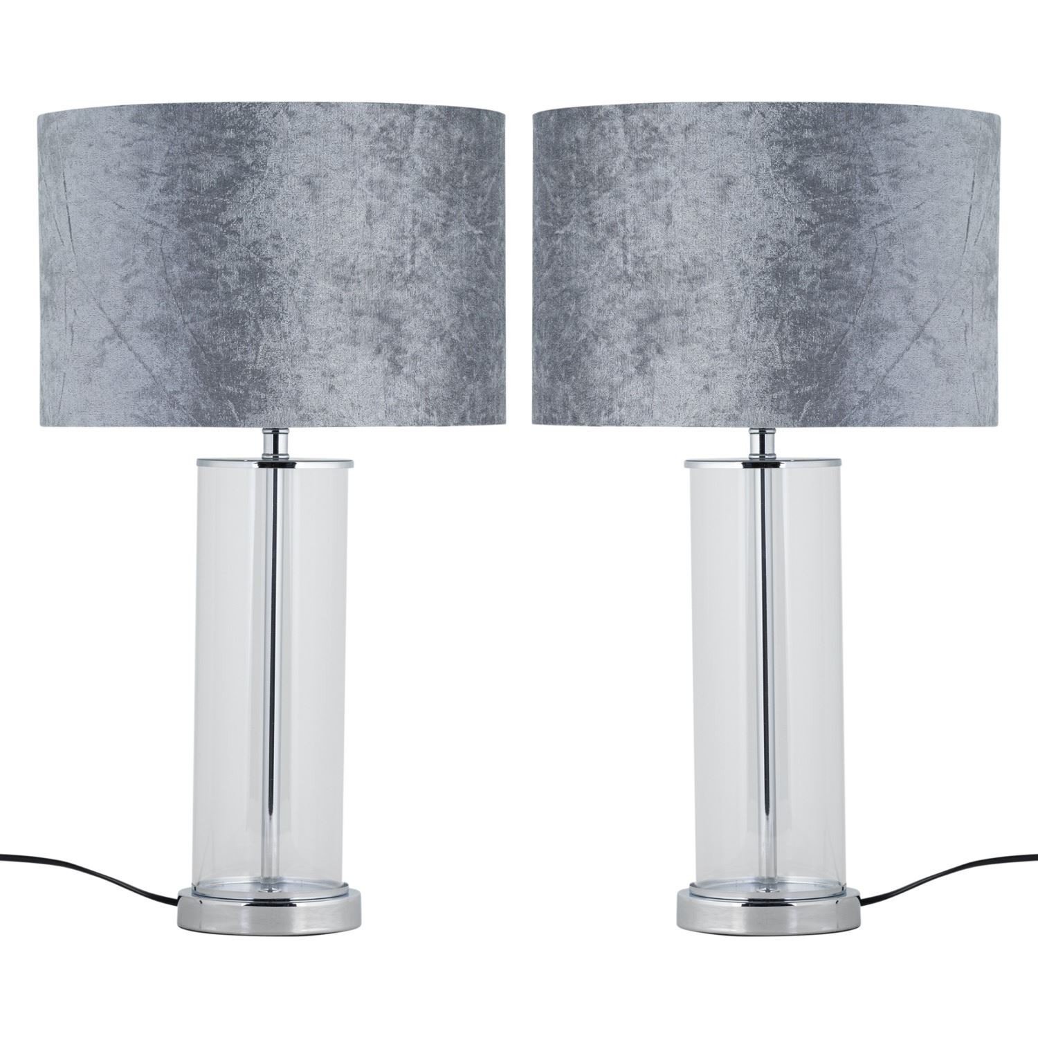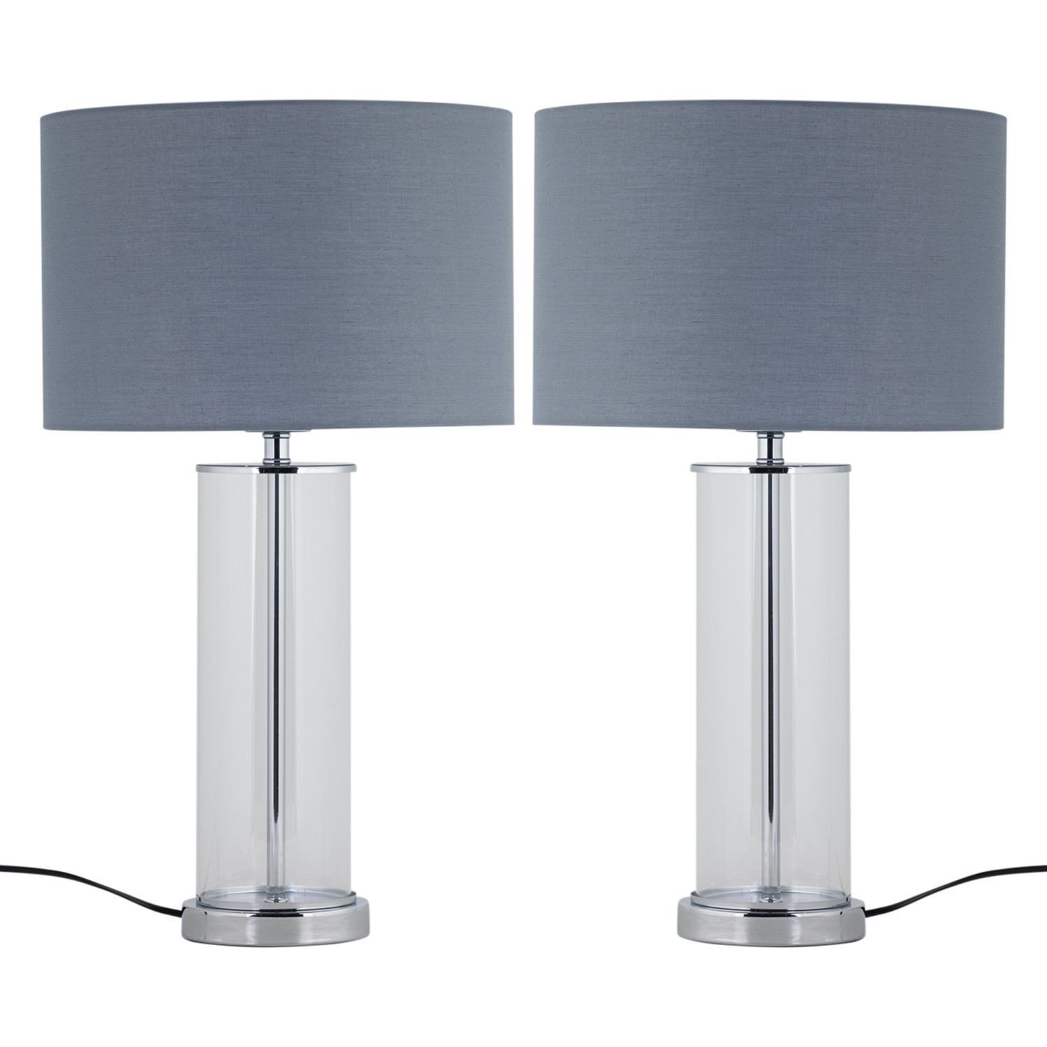 Set of 2 Modern Chrome & Glass Table Lamp Bedside Lights Grey Cotton Shades