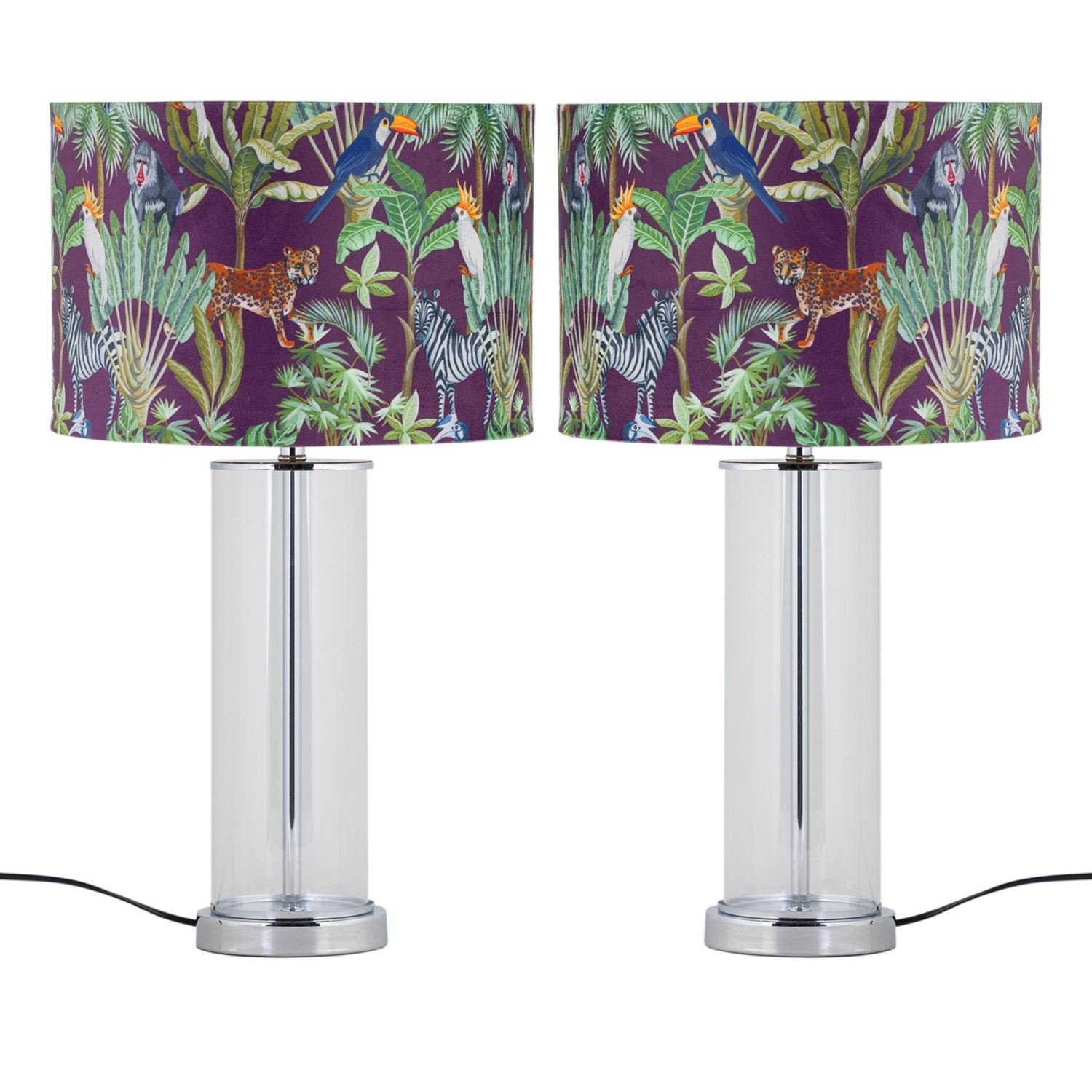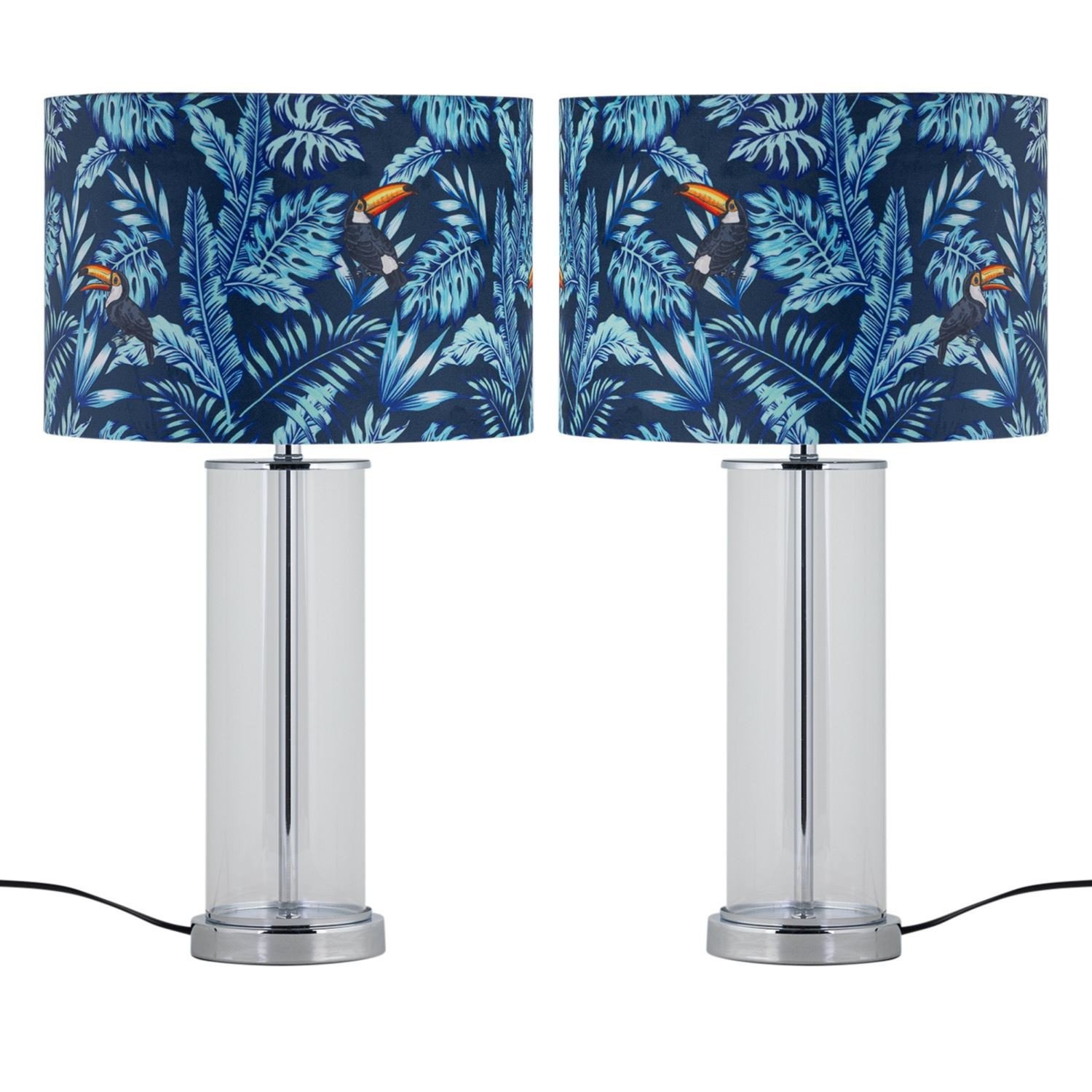 Set of 2 Modern Chrome & Glass Table Lamp Bedside Lights Toucan Velvet Shades