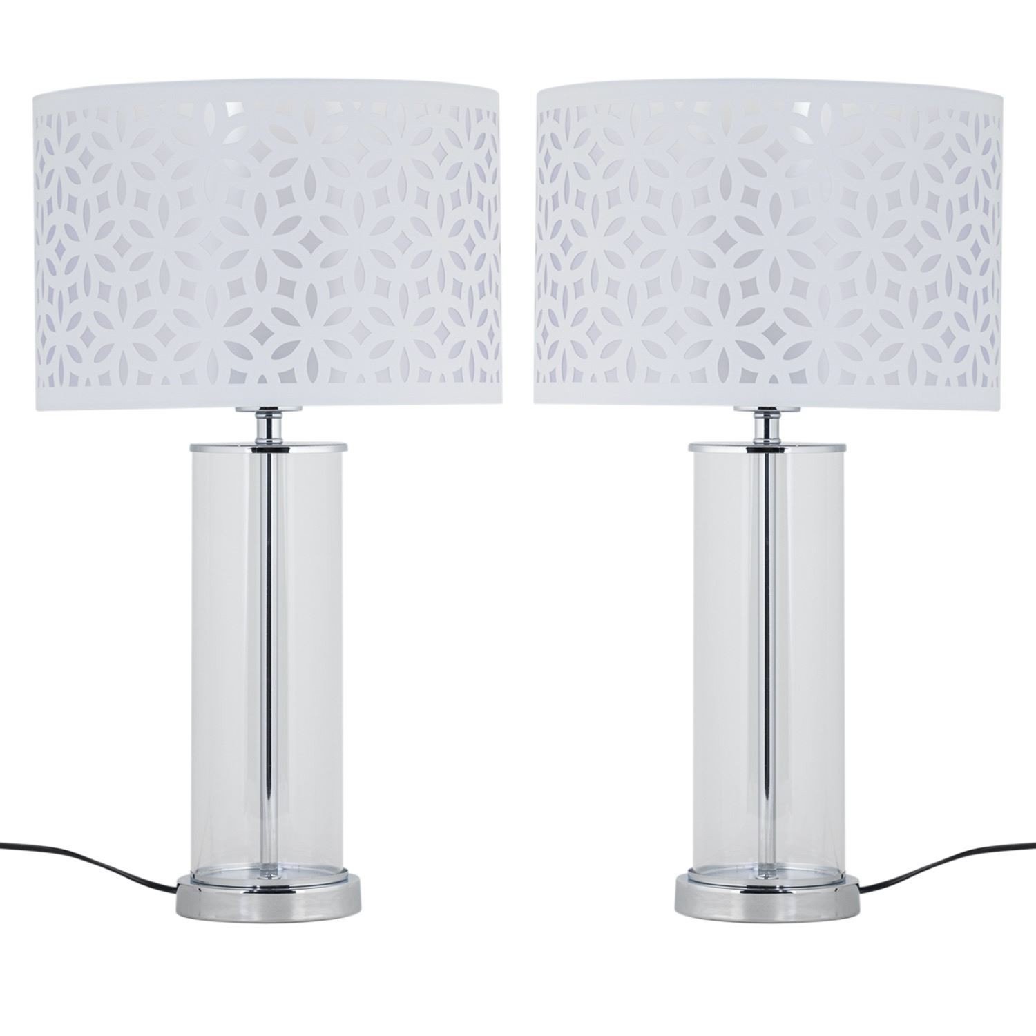 Set of 2 Modern Chrome & Glass Table Lamp Bedside Lights White Cut Out Shades