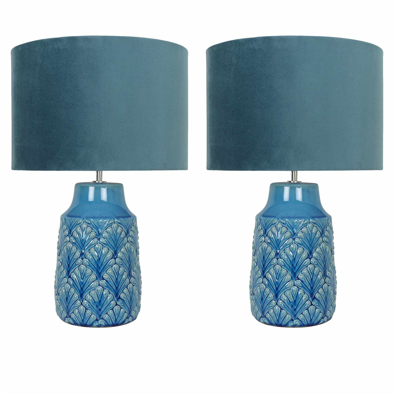Set of 2 Stylish Teal Ceramic Table Lamp Bedside Lights Matching Velour Shades
