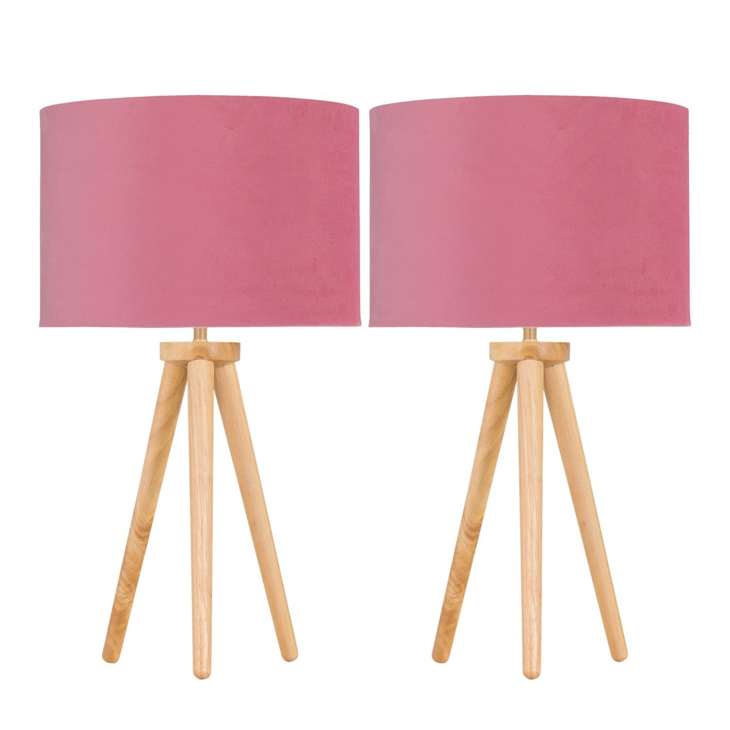 Set of 2 Modern Light Oak Table Lamp Bedside Lights Wood Tripod Flamingo Shades