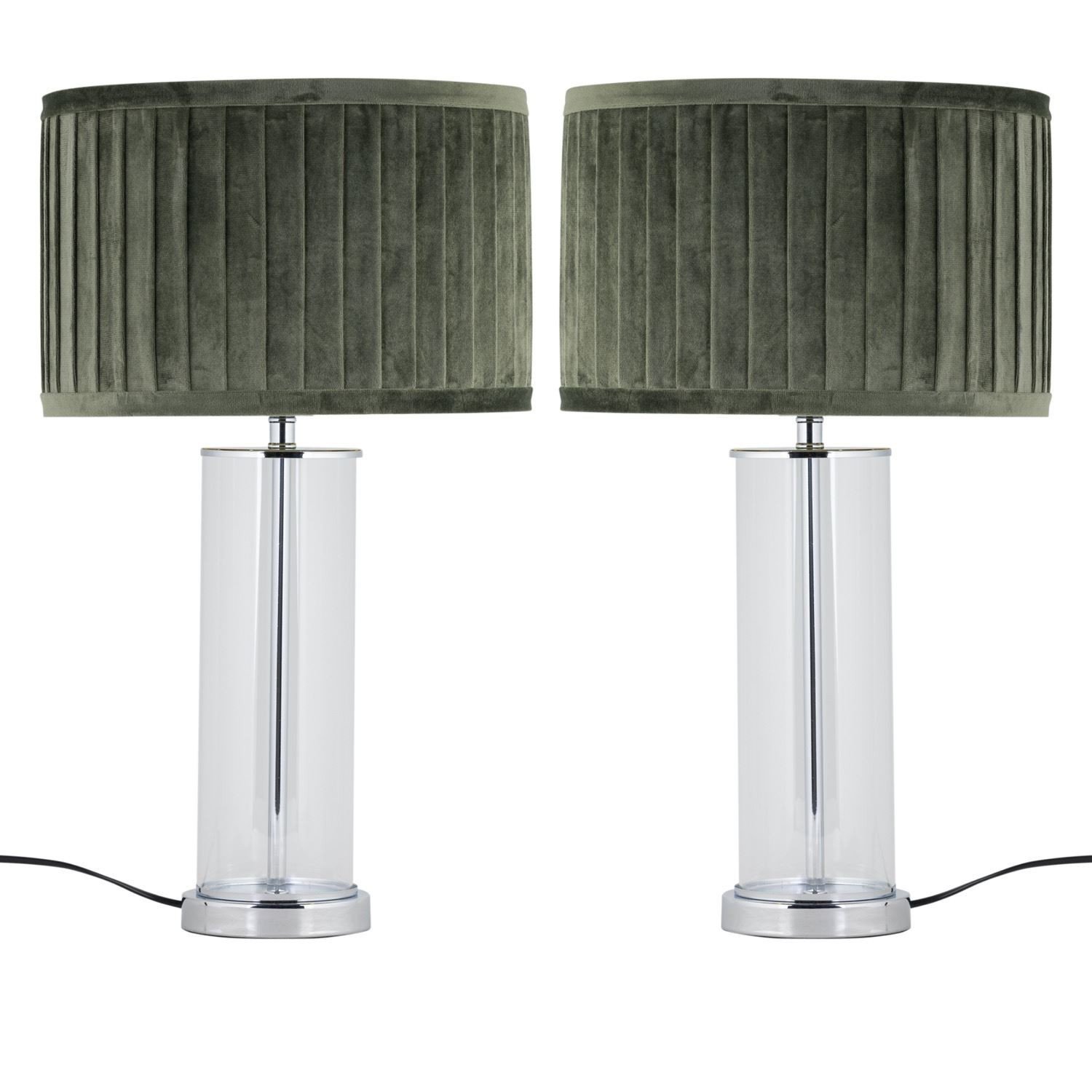 Set of 2 Modern Chrome Glass Table Lamp Bedside Lights Green Pleat Velvet Shades