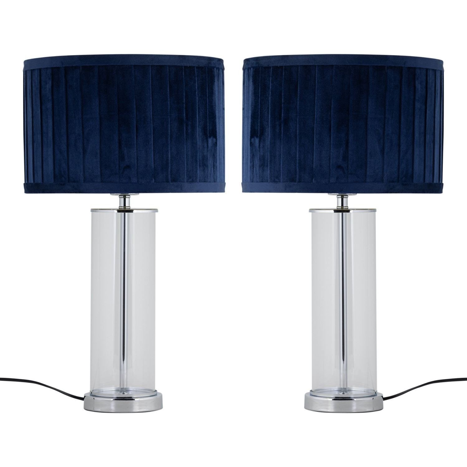Set of 2 Modern Chrome & Glass Table Lamp Bedside Lights Navy Blue Pleat Shades
