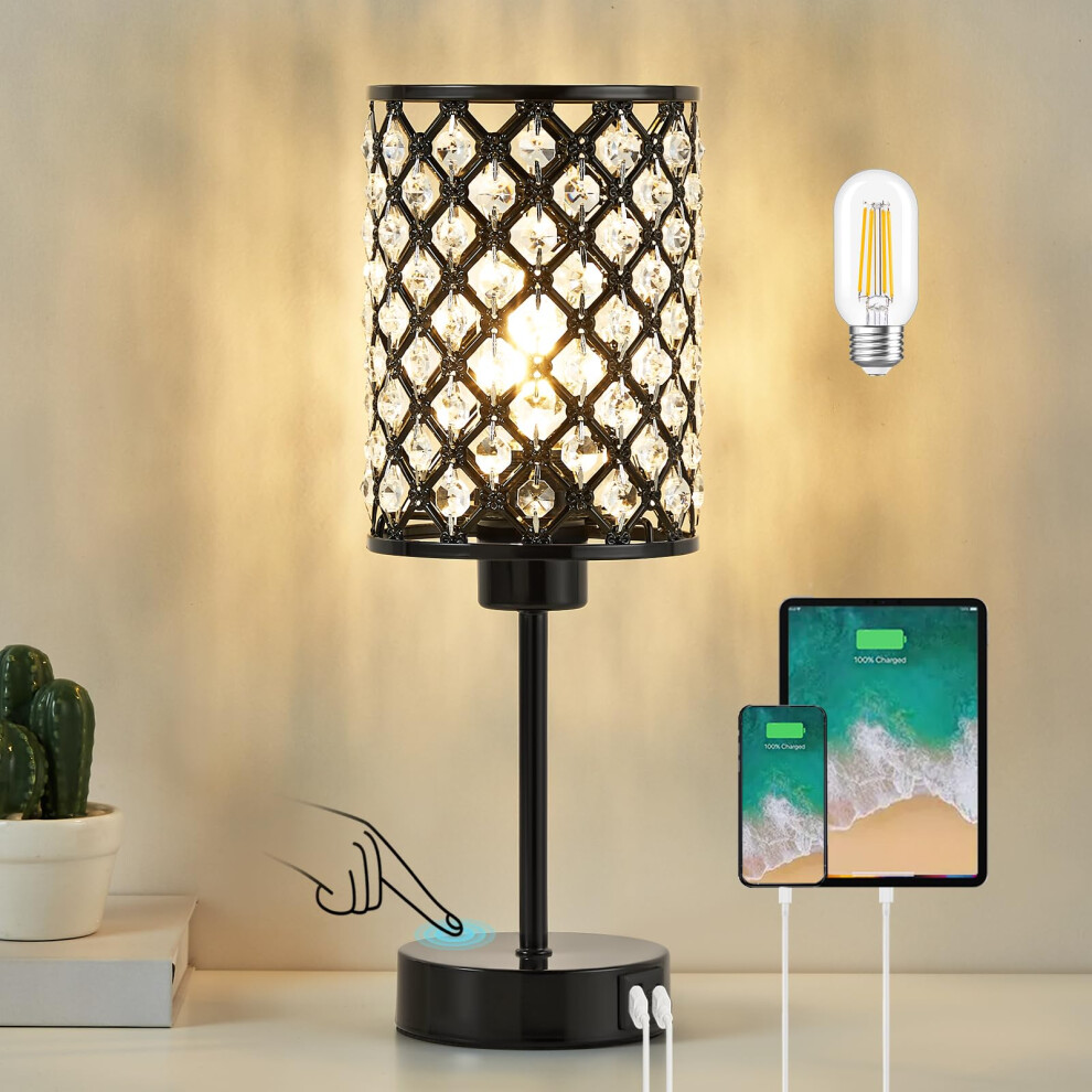 GyroVu Crystal Table Lamp, Black Lamp for Bedroom Nightstand with USB C+A Ports, 3 Way Dimmable Touch Lamp with Crystal Shade, Bedside Lamp Small Lamp