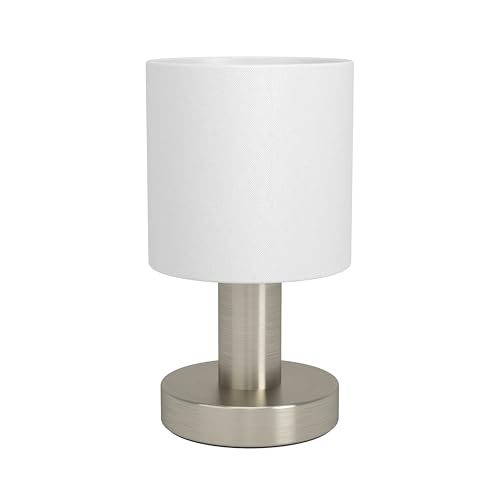 Eglo Bedside Table lamp Monetto, Small Decorative Light Fixture, Elegant Living Room and Bedroom Lighting, Silver Metal with White Fabric lampshade, E14 Socket, H 18 cm