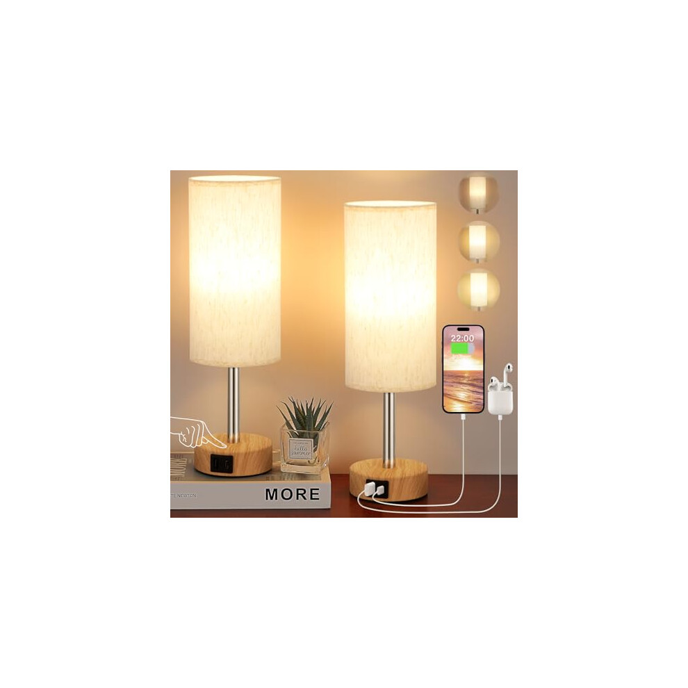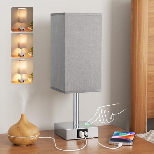 Bedside Lamps Set of 2 Touch Table Lamps with USB-C USB-A Charging Ports, 3 Way Dimmable Bedside Lamp for Bedrooms, Small Touch Lamps for Living Room (Bulb Included)