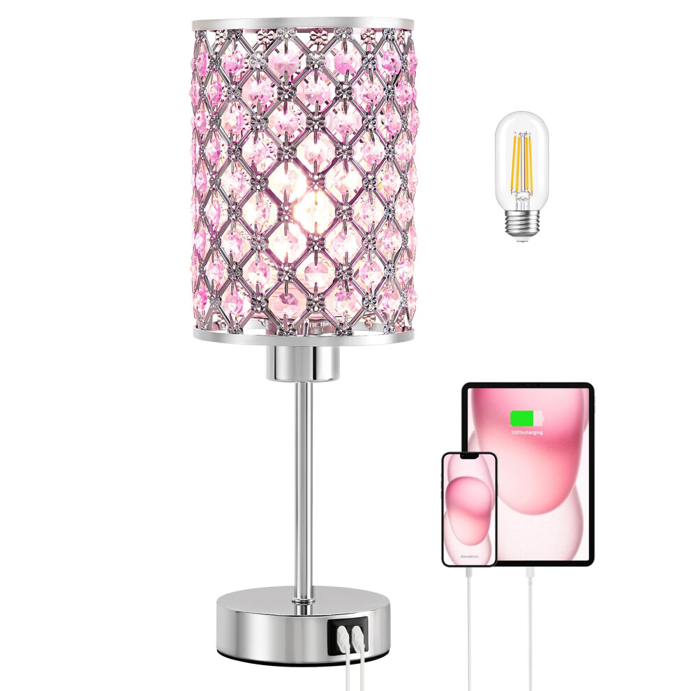 Crystal Table Lamp, Pink Touch Lamp with USB C+A Ports, 3 Way Dimmable Lamp with Crystal Shade, Bedside Lamp Small Lamp for Girl Bedroom, Living