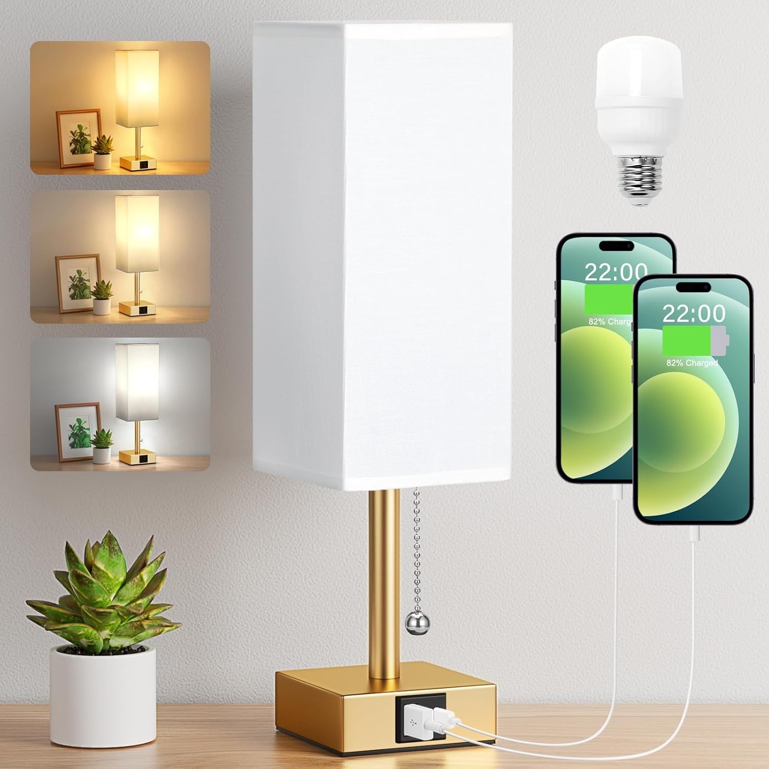 Aooshine Gold Bedside Lamp, Small Lamp with 3-Color Modes with Pull Chain, Lamps with White Fabric Shade(Bulb Included)