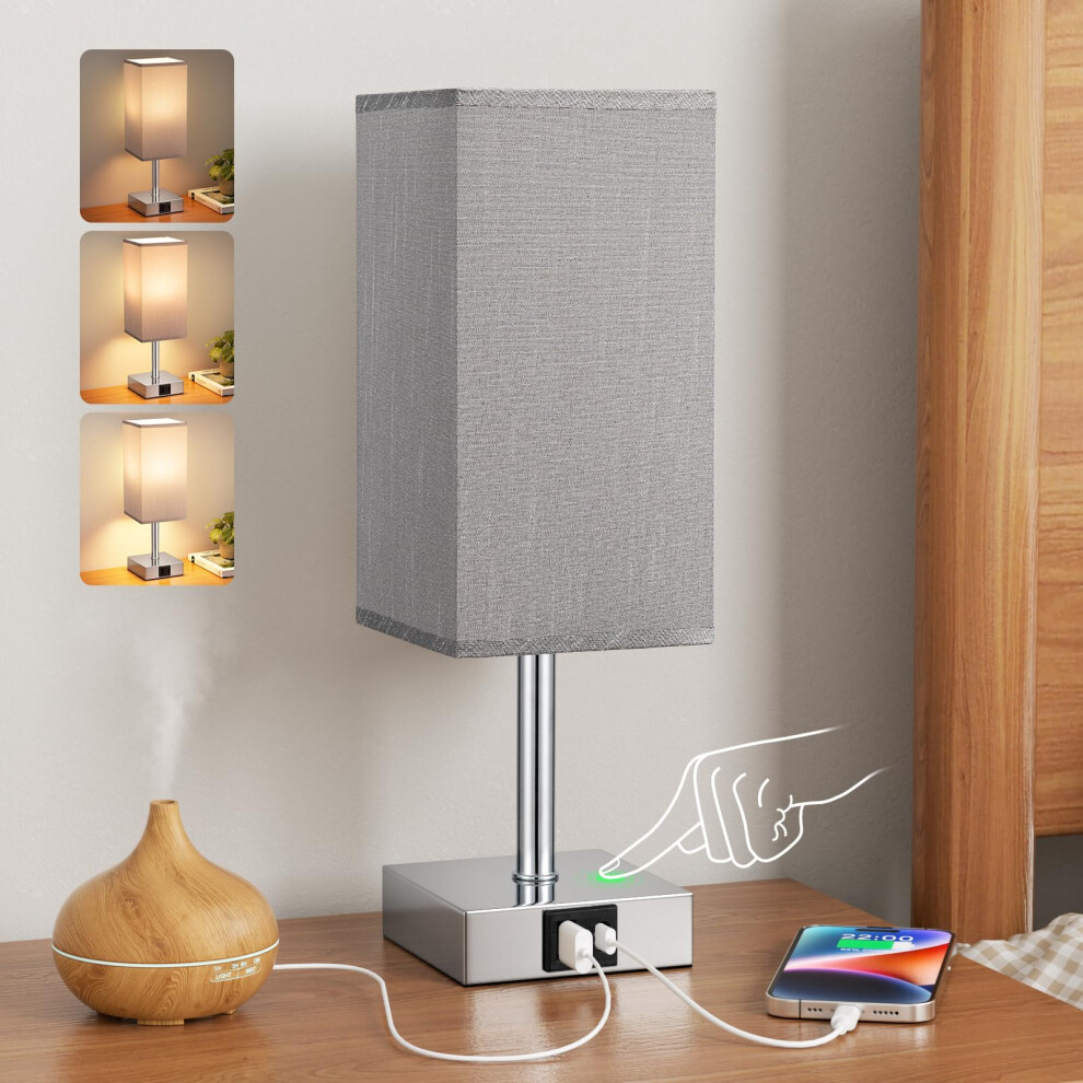 Wudyfei Touch Bedside Lamps, Small Dimmable Table Lamps with USB C+A Charging Ports, LED Minimalist Bed Side Nightstand Lamp with Fabric Shade for Bedroom, Living Room, Kids Room, Study, Dorm, Office