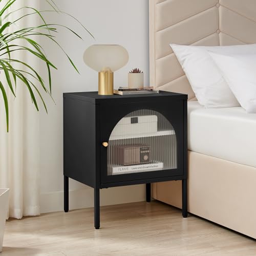 Furniturebox UK Black Metal Bedside Table - Urbi - Bedside Cabinet With Door - Bedroom Storage - Glass Panel - Internal Shelf for 2 Tiers Of Storage - Industrial Meets Art Deco - Bedroom Furniture