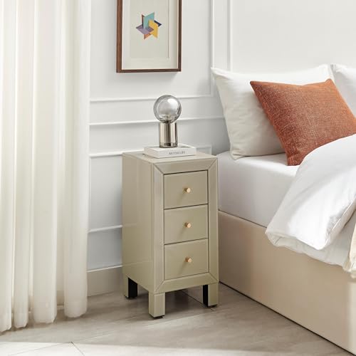 Furniturebox UK Lexi Contemporary Small Taupe Mirrored Bedside Table, Grey Beige Slimline Side Table Bedroom Cabinet Modern Slimline 3 Drawer Reflective Stylish Bedroom Furniture