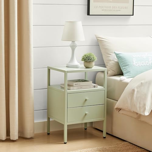 Furniturebox UK Bedside Table Lykke Pale Green Metal Bedside Cabinet with 2 Drawers & Shelf, Compact Scandi Nightstand for Bedroom Storage, Modern Minimalist Design