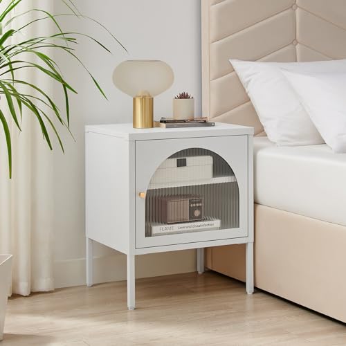 Furniturebox UK White Metal Bedside Table - Urbi - Bedside Cabinet With Door - Bedroom Storage - Glass Panel - Internal Shelf for 2 Tiers Of Storage - Industrial Meets Art Deco - Bedroom Furniture