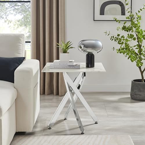 Furniturebox UK Leonardo Glass White Marble Effect Square Side Table Bedside Table - Shiny Silver Metal Legs Stylish Nested Starburst Design - Modern Living Room Bedroom Furniture Contemporary Homes