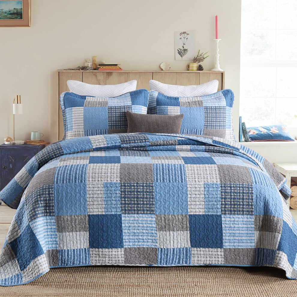 PANGUSHAN Quilts Set Queen Size 100% Cotton Patchwork Plaid Quilt Bedding Set Blue/Navy Blue Reversible Bedspreads Farmhouse Lightweight Comforter Se