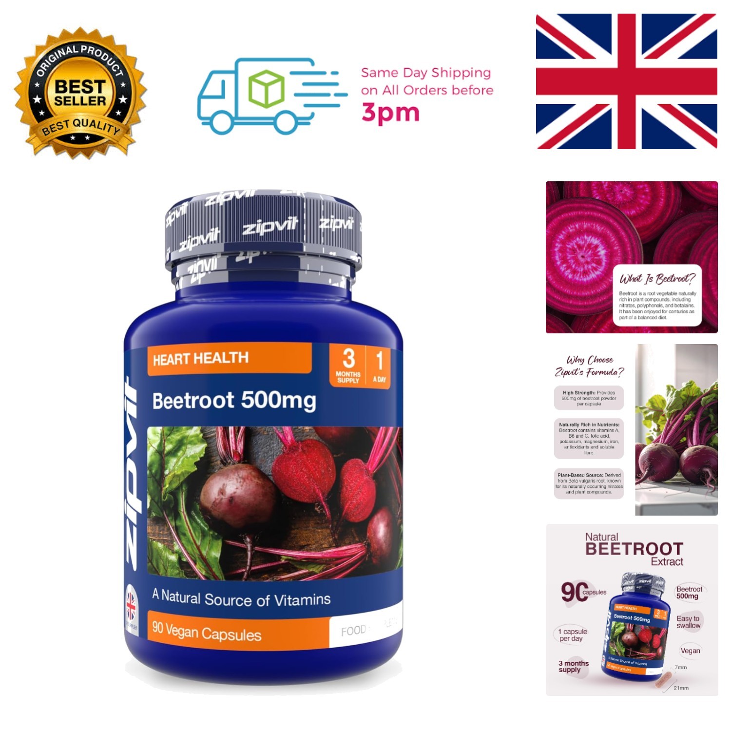 Zipvit Beetroot Capsules 500mg, 90 Vegan Capsules, Beetroot Supplement, Naturally Rich in Vitamin A, B6 and Vitamin C