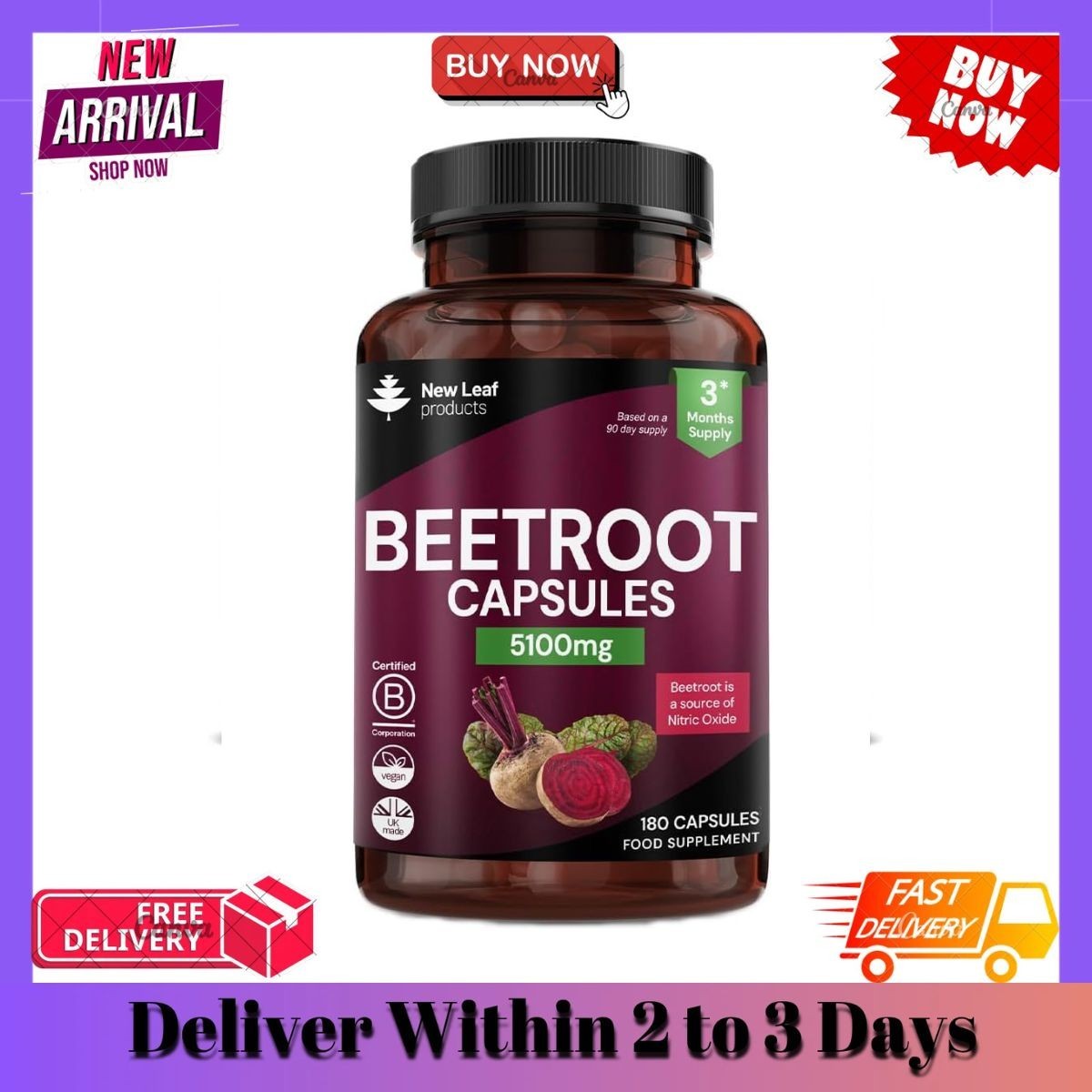 New Leaf Product Beetroot Capsules - Potent 5100mg P/S 180 Vegan Capsule + Black Pepper