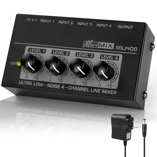 OFFCUP 4 Channel Audio Mixer, Mini 12V Compact Low Noise Line Mixer, Metal Karaoke Sound Mixers with Separate Volume Adjustment for Guitar Bass Keyboard Stage Microphone Mixer (Black)