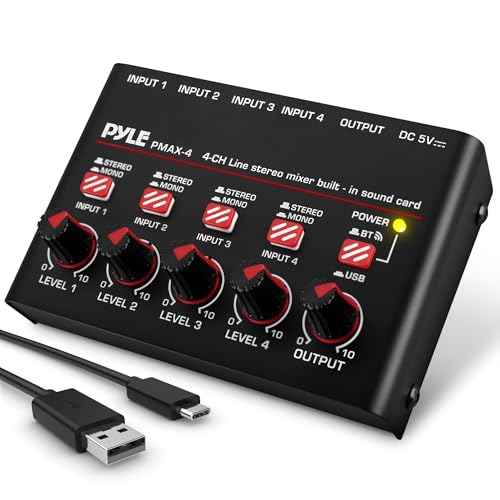 PYLE Mini Audio Mixer – 4 Channel Bluetooth USB Sound Console for Microphone, Music & Karaoke, Compact Design, High Relevance for Podcasting & Home Studio, Plug & Play Setup