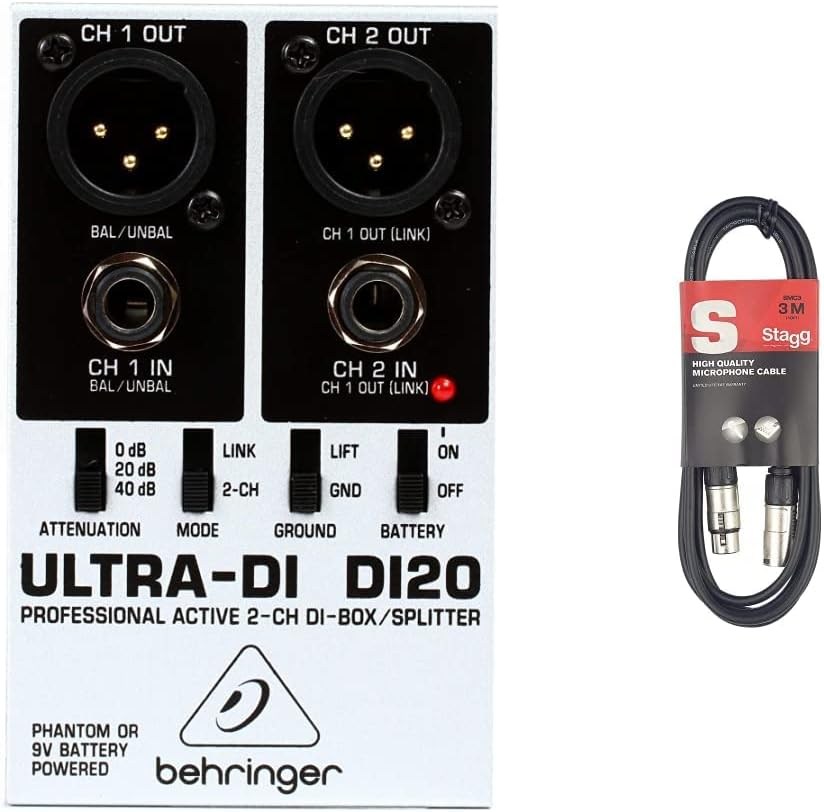 Behringer DI20 Ultra-Di 2 Channel DI Box/Splitter & Stagg 3M / 10Ft XLR to XLR C