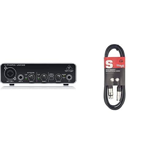 Behringer UMC22 audiophile 2x2 USB audio interface with Midas microphone preamp & Stagg SMC3 3m XLR to XLR Plug Microphone Cable, Black