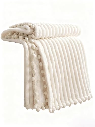 DISSA Fleece Blanket Twin Size – 51x63, Beige – Soft, Plush, Fluffy, Fuzzy, Warm, Cozy – Perfect Throw for Couch, Bed, Sofa - with Pompom Fringe - Flannel Blanket Throw Blanket