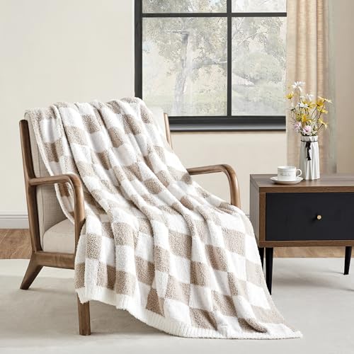 Snuggle Sac Checkered Blanket, Beige Throw Blanket for Couch Plaid Microfiber Fluffy Warm Cozy Fuzzy Soft Throw Blanket Reversible Checkerered Blankets for Sofa, Chair, Bed, 50x60 inches