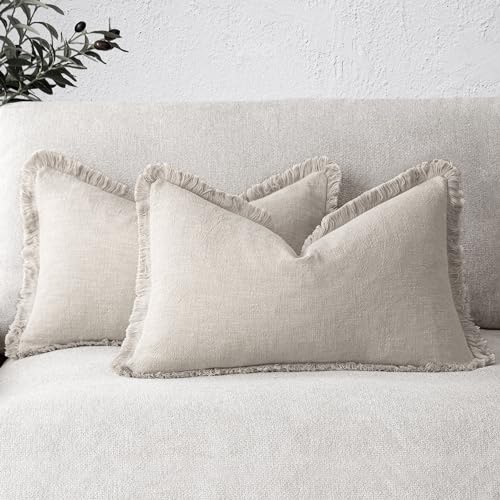 Foindtower Set of 2 Decorative Lumbar Pillow Covers, Linen Fringe Boho Throw Pillow Covers with Tassels, Cosy Pillow Covers for Sofa, Couch, Bed, Living Room, Home Decor, 28 x 48 cm, Natural Beige