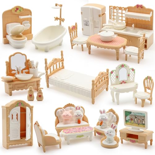 36Pcs Dollhouse Furniture Set Miniature Accessories Pretend Play Furniture for Dolls House 1:12 Scale Bathroom Bedroom Living Room Kitchen Furniture with Bunny for Kids Birthday Christmas(Beige)