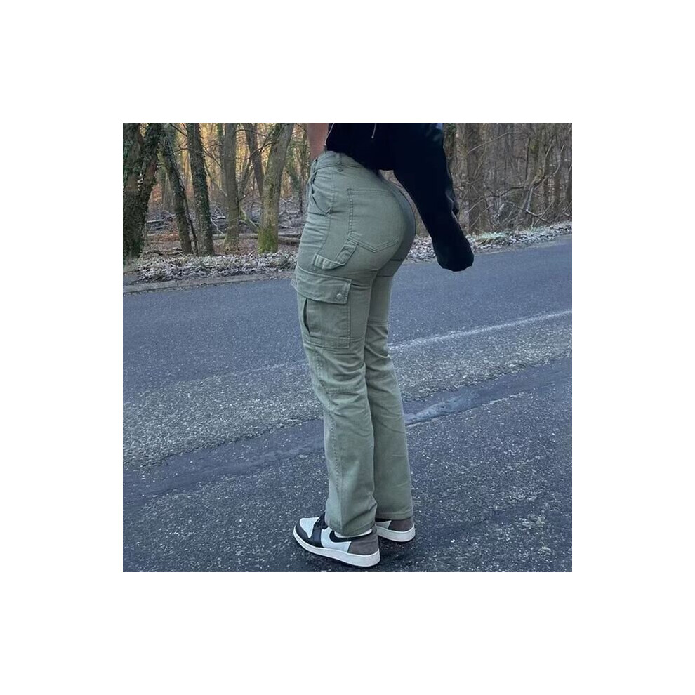 (Green Beige-M) Cargo Pants Women 90S Streetwear Y2K Big Pockets Jeans Women High Waist Pants Trousers Denim Zipper Jeans 90S Patched