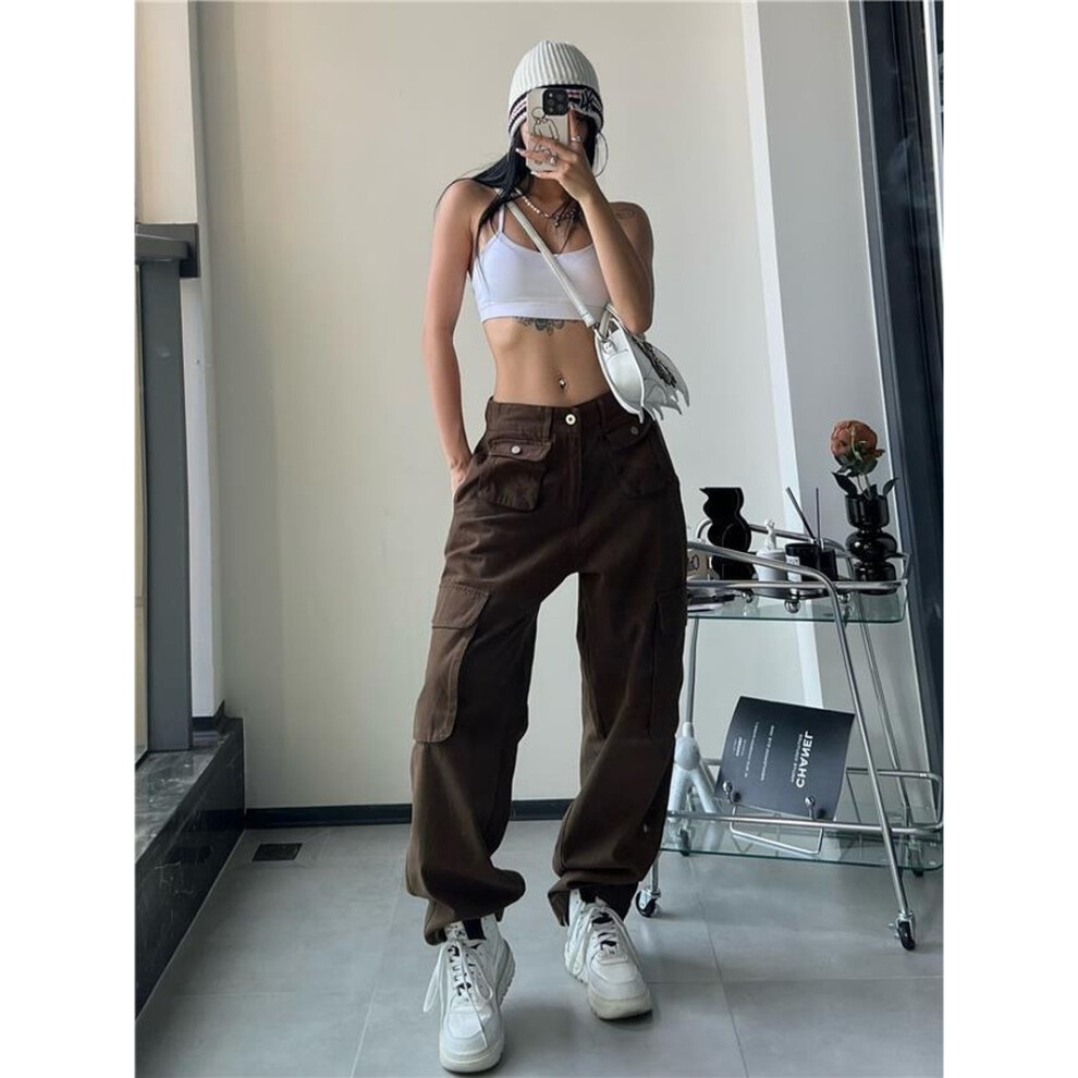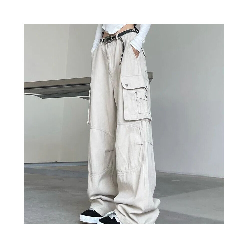 (11 Beige-L) Pocket Cargo Pants Women High Street Vintage Loose Y2K Pants High Waist Casual Street Hip Hop Women Pants