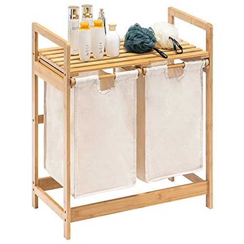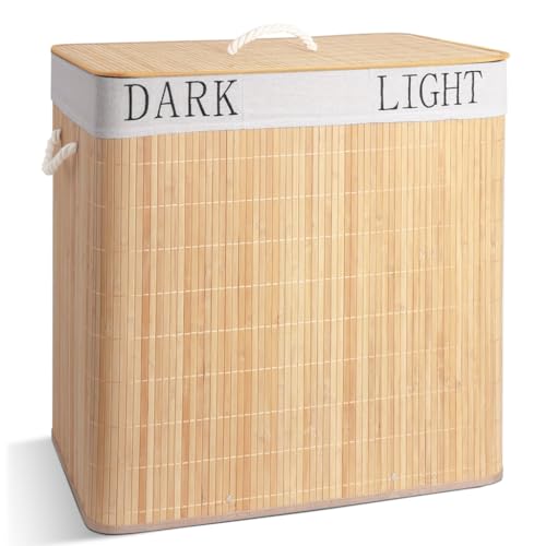 YOUDENOVA Bamboo Laundry Basket with 2 Collapsible Pull-Out Laundry Hamper, Laundry Storage Organizer for Bedroom Laundry Room or Bathroom, 73 x 64 x 33 cm Beige