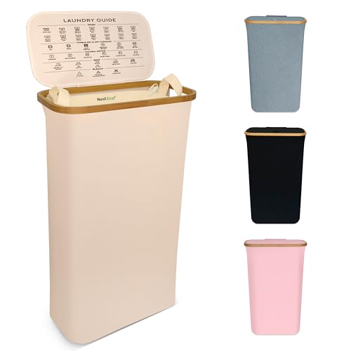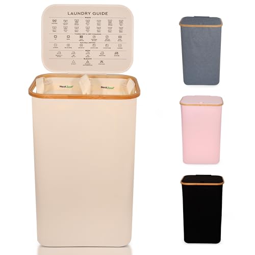 Nest Zest 60L Slim Laundry Basket with Lid, Washing Basket for Laundry, Hamper style Linen Bin with Care Guide & Removable Inner Bag, Dirty Clothes Bin with Sturdy Bamboo Rim and Oxford Fabric (Beige)