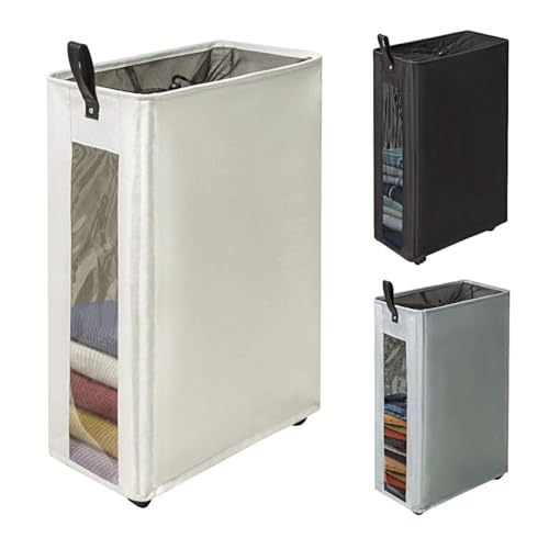 ZERO JET LAG 25 Inches Slim Laundry Storage Hamper - Large Rolling Clothes Hamper - Rolling Storage Bin - Tall Corner Basket - Clear Window Visible - Dirty Laundry Bin - (Beige) - Slim Hamper