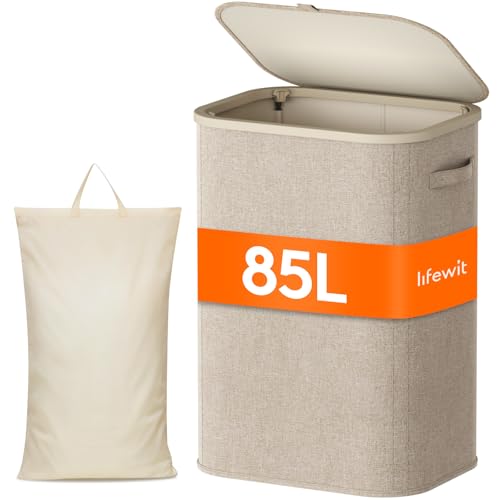 Lifewit 85L Laundry Basket with Lid, Large Laundry Hamper with Plastic Handles and Removable Bag, Foldable Tall Dirty Clothes Hampers for Laundry for Laundry Room, Bedroom, Bathroom, Dorm, Beige