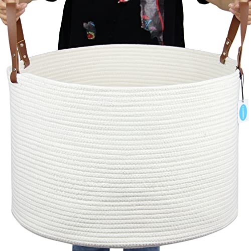 KAKAMAY Large Cotton Rope Storage Basket (20"x13"),Woven Baby Laundry Hamper,Blanket Basket for Nursery, Laundry, Living Room, Pillows, Toys (White/Beige)
