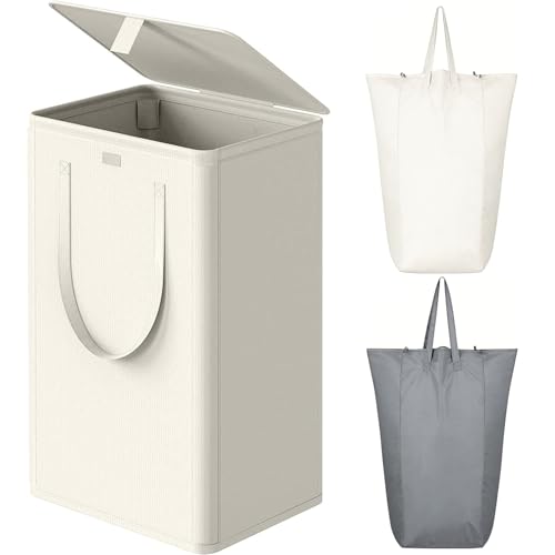 WOWLIVE 100L Laundry Hamper with Lid, Large Foldbale Laundry Basket with 2 Removable Bags and Handles, Tall Collapsible Dirty Clothes Hamper for Laundry Room, Bathroom, Dorm (Beige)
