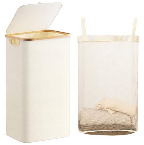 Famyards Laundry Hamper with Lid, 100L Large Laundry Basket with Bamboo Handles and Removable Inner Bag, Collapsible Dirty Clothes Hamper Laundry Bin for Bathroom, Bedroom, Dorm Laundry Room(Beige)