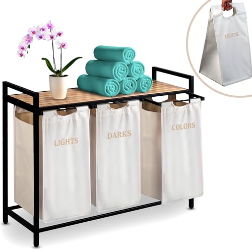 Massido Laundry Basket 3 Compartments 120 L with Laundry Bags and Shelf Laundry Sorter Laundry Rack Beige 93 x 72 x 32 cm