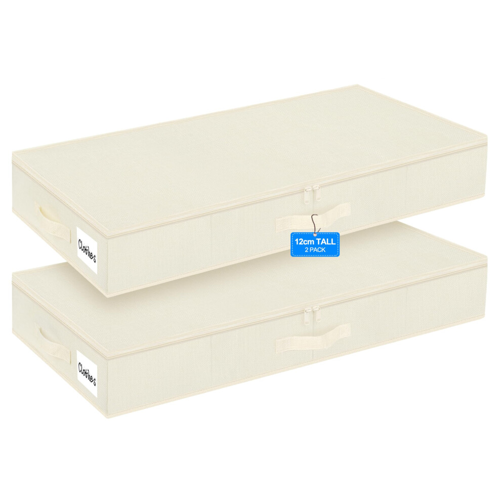 Huquter Low Under Bed Storage Box with Lid, 2 Pcs 12 CM Tall Low Beige Underbed Storage Boxes with Bottom Support, Foldable Fabric Shallow Under Bed Storage Bag with Zip for Clothes Beddings