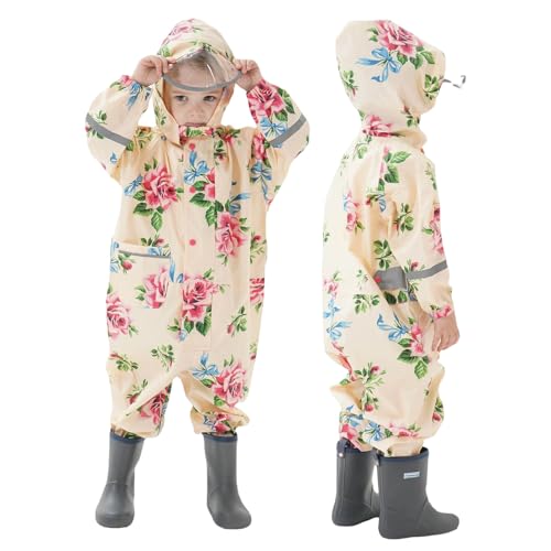 Girls' Floral Print Raincoat with Clear Visor Beige Waterproof Jacket with Pink Rose Pattern, Detachable Hood Shield Rain Suit for Face Protection, Cute Rainwear for Wet Weather