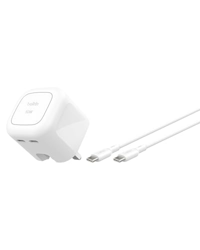 Belkin SmartProtect 2-Port USB-C Charger 50W, Dual-Port GaN Charger, 1m USBC Cable Included, Fast Charging for MacBook, iPhone 17, iPad Pro, Chromebook, Galaxy S25 Ultra, Pixel 10 - White