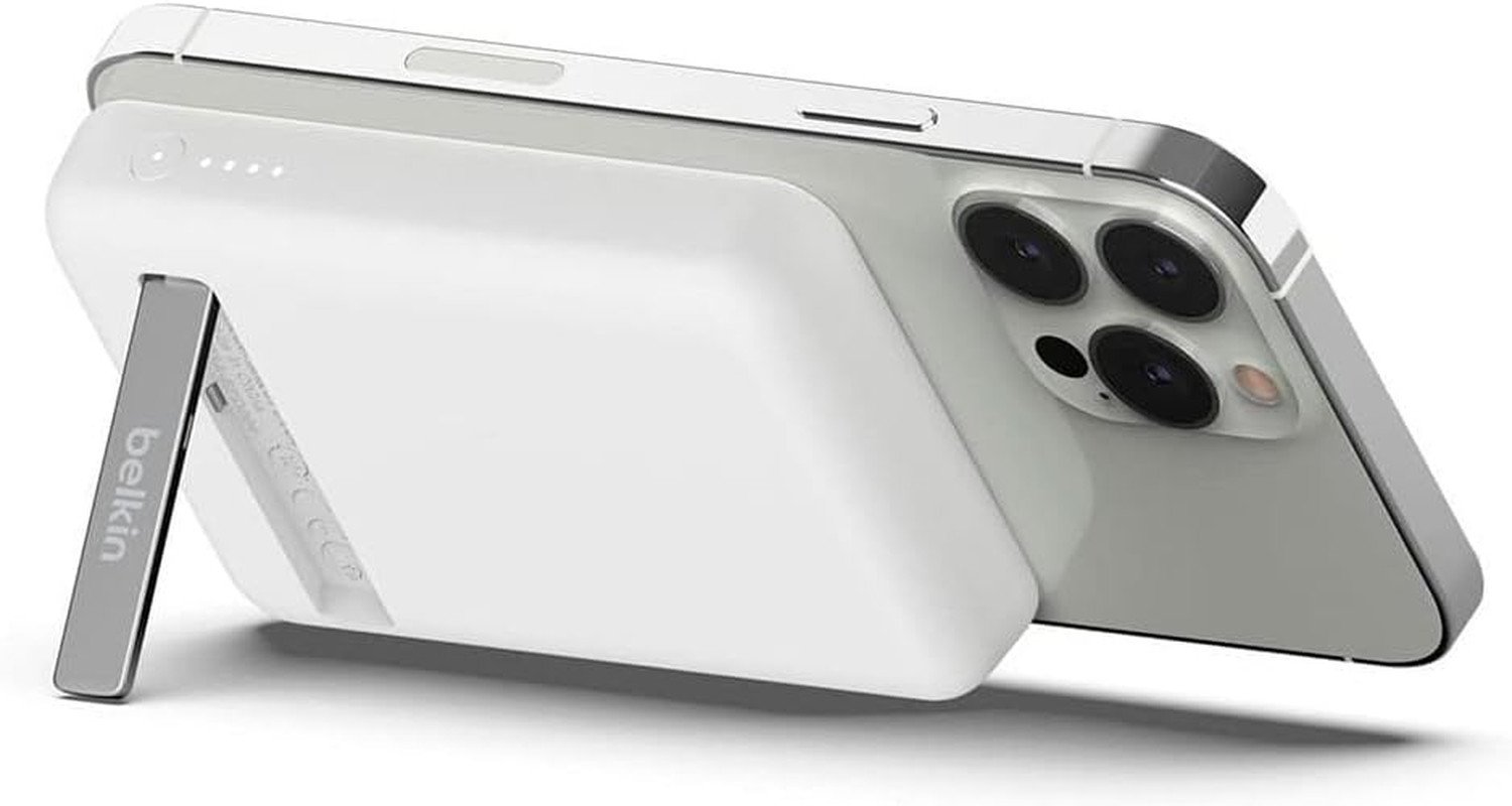Belkin 5000mAh Magnetic Wireless Power Bank, Portable Charger Compatible with MagSafe, Battery Pack with 7.5W Output, 10W Input and Kickstand, Compatible with iPhone 16, 15, 14, 13, 12 Series - White
